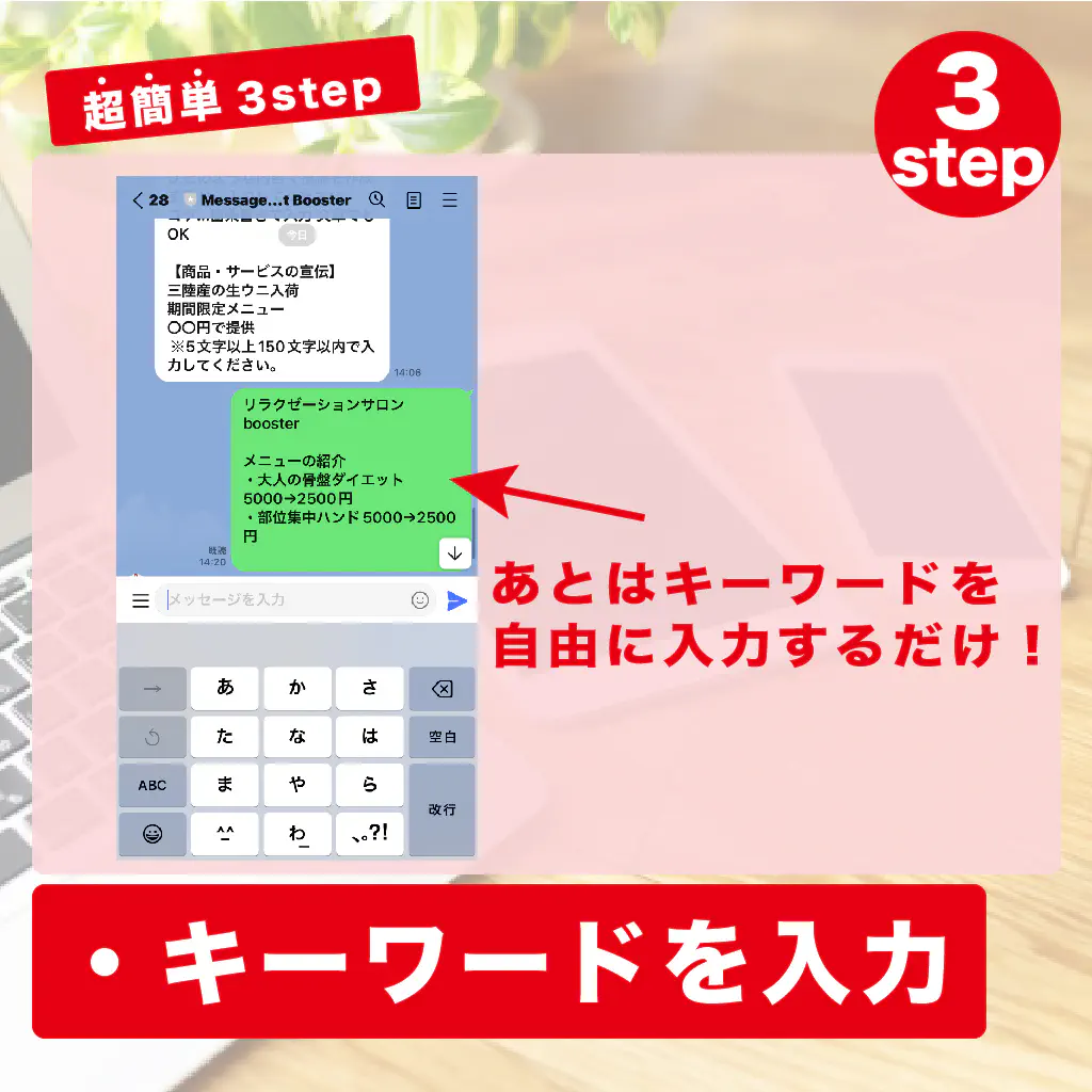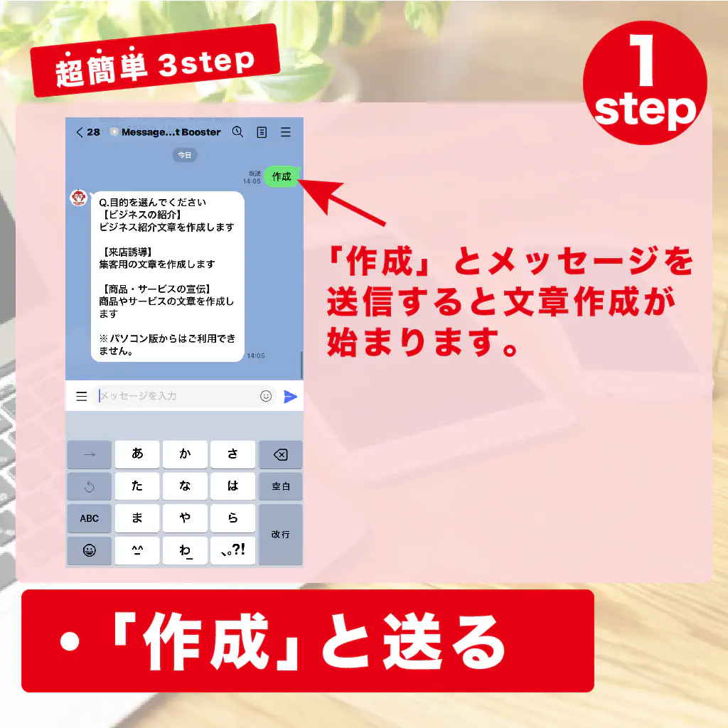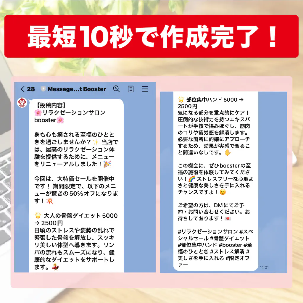 ドラフト作成の自動化LINEのトーク画面からChatgptを活用して、最適な投稿ドラフトを自動的に作成します。あなたのお店の特徴やニーズに合わせた投稿を簡単に作成できます。